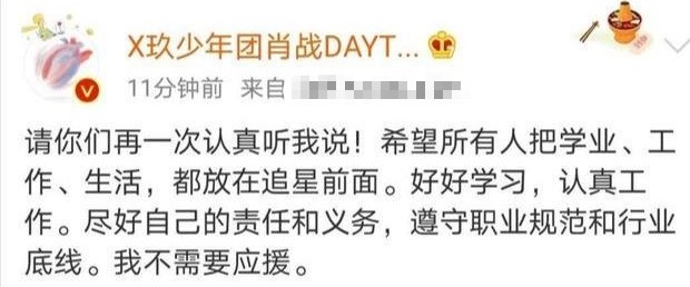 随后,肖战在社交平台发文回应此事,「请你们再一次认真听我说!希望所有人把学业、工作、生活,都放在追星前面。好好学习,认真工作。尽好自己的责任和义务,遵守职业规范和行业底线。我不需要应援。」