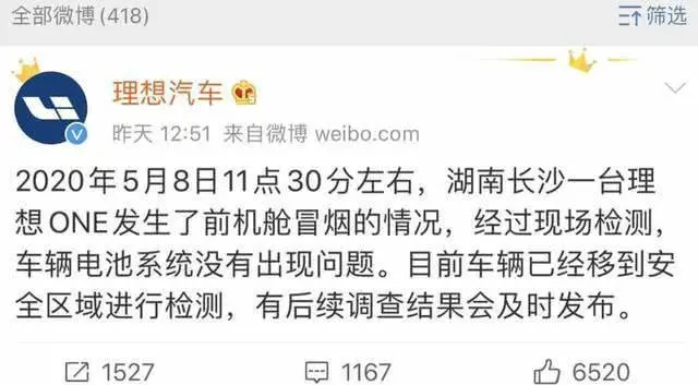 据媒体报道,最近,湖南长沙的理想一号烟在前舱内冒烟并自燃。随后,消防人员及时对车辆进行了灭火处理。理想的汽车官员对微博紧急回应:经过现场测试,汽车电池系统没有问题。目前,车辆已移至安全区域进行测试,后续调查结果将及时发布。