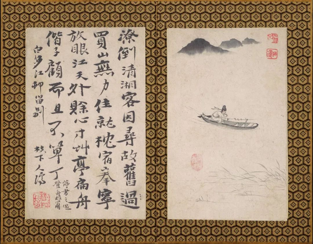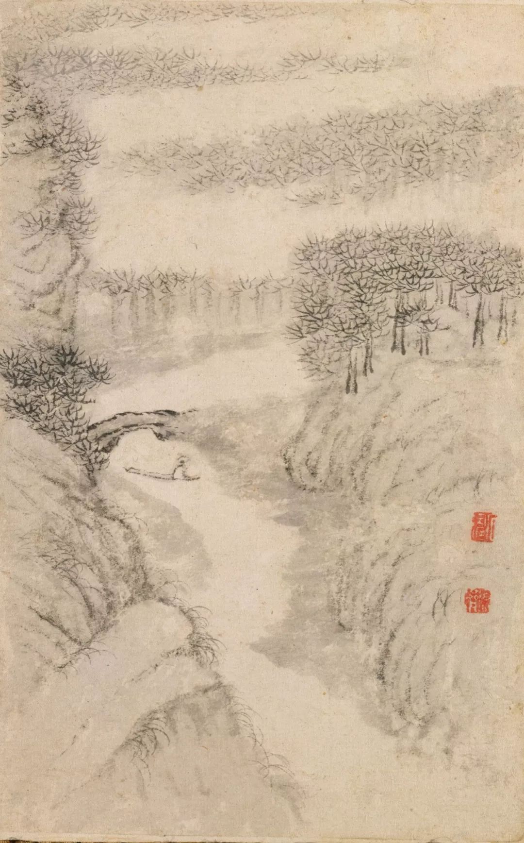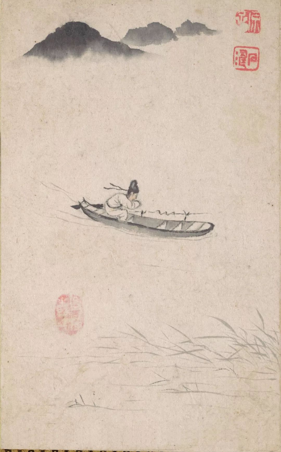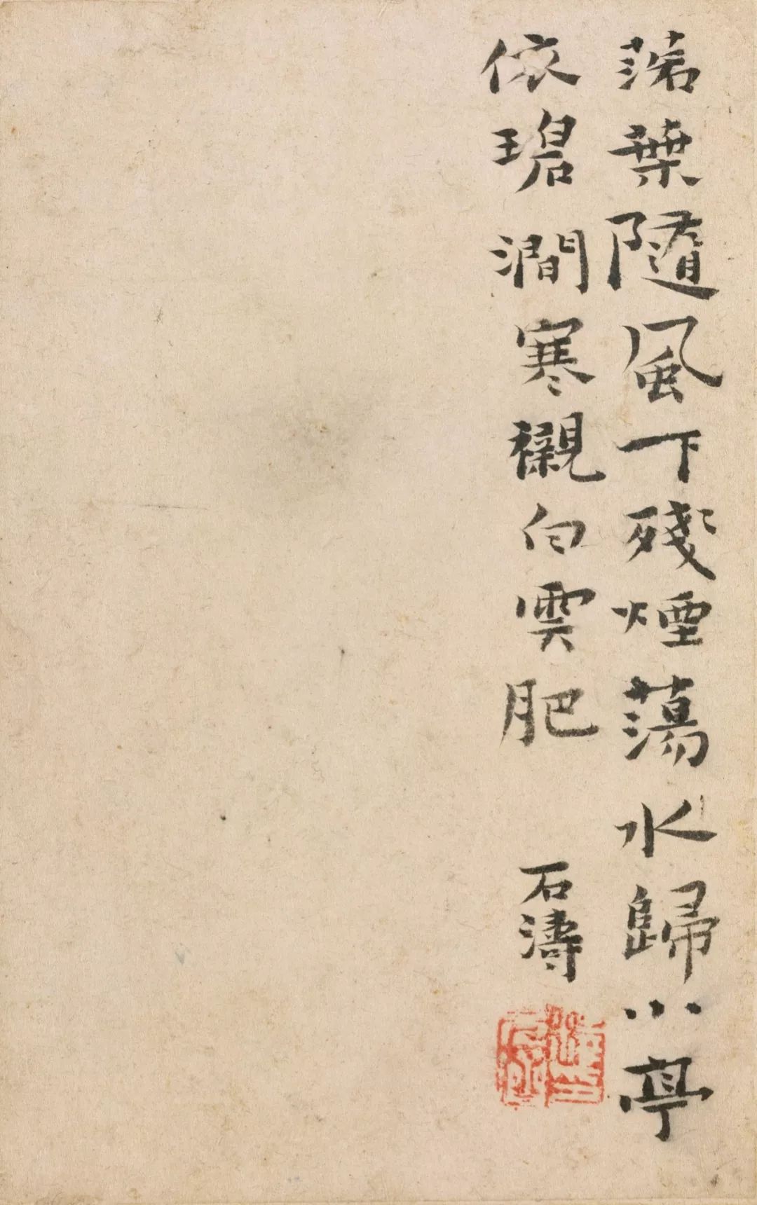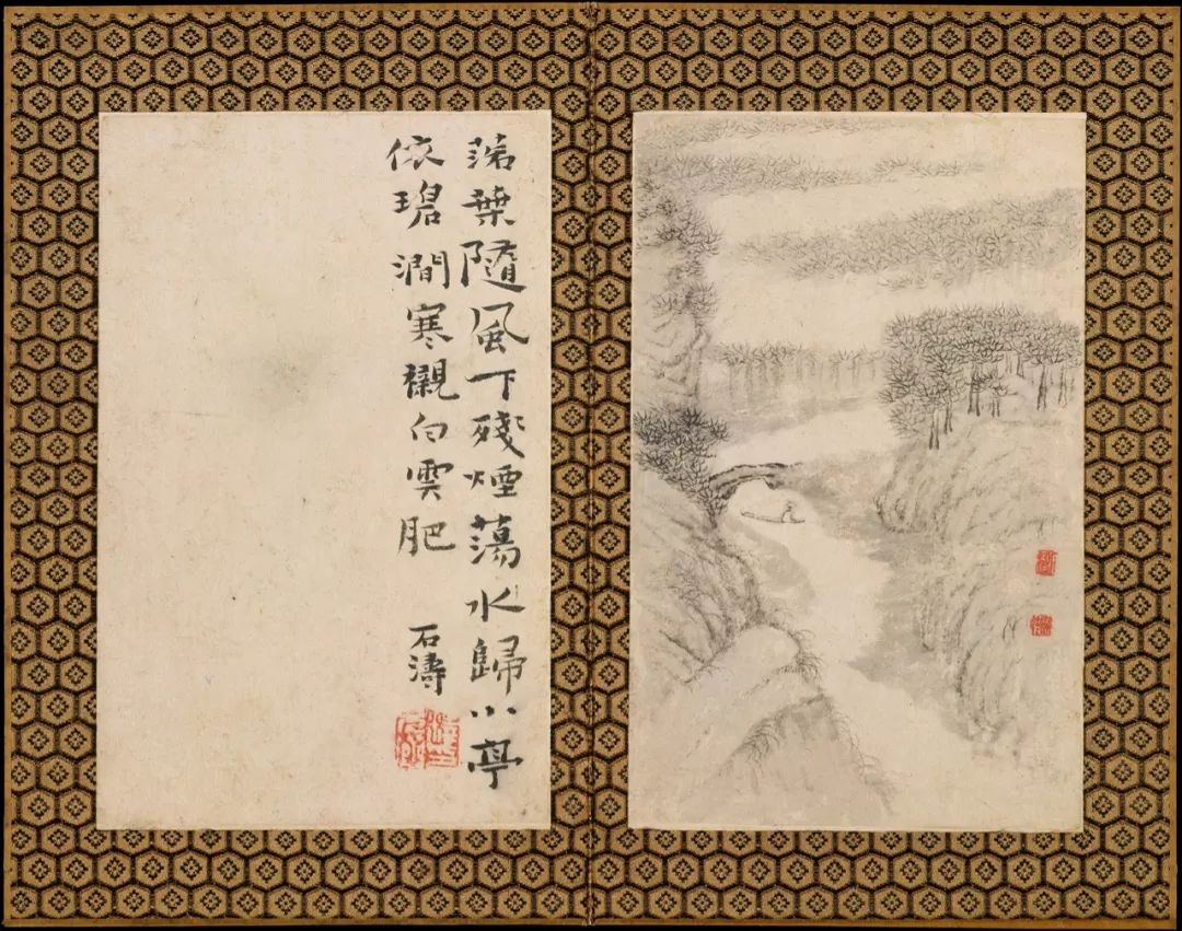 此件《归棹册页》,内含十二开,尺寸:21.1×13.5cm,美国大都会博物馆藏。每幅册页中均在画面左侧配以诗文解说,寄情于画,同时助于看画之人理解。落款:“石涛”、“石道人”、“清湘道人济”、“苦瓜老人济”、“瞎尊者济”、“瞎尊者原济”、“清湘小乘客济”、“济”、“小乘客济”等;钤印:“原济”、“石涛”、“前有龙眠济”、“苦瓜和尚”、“释元济印”等。