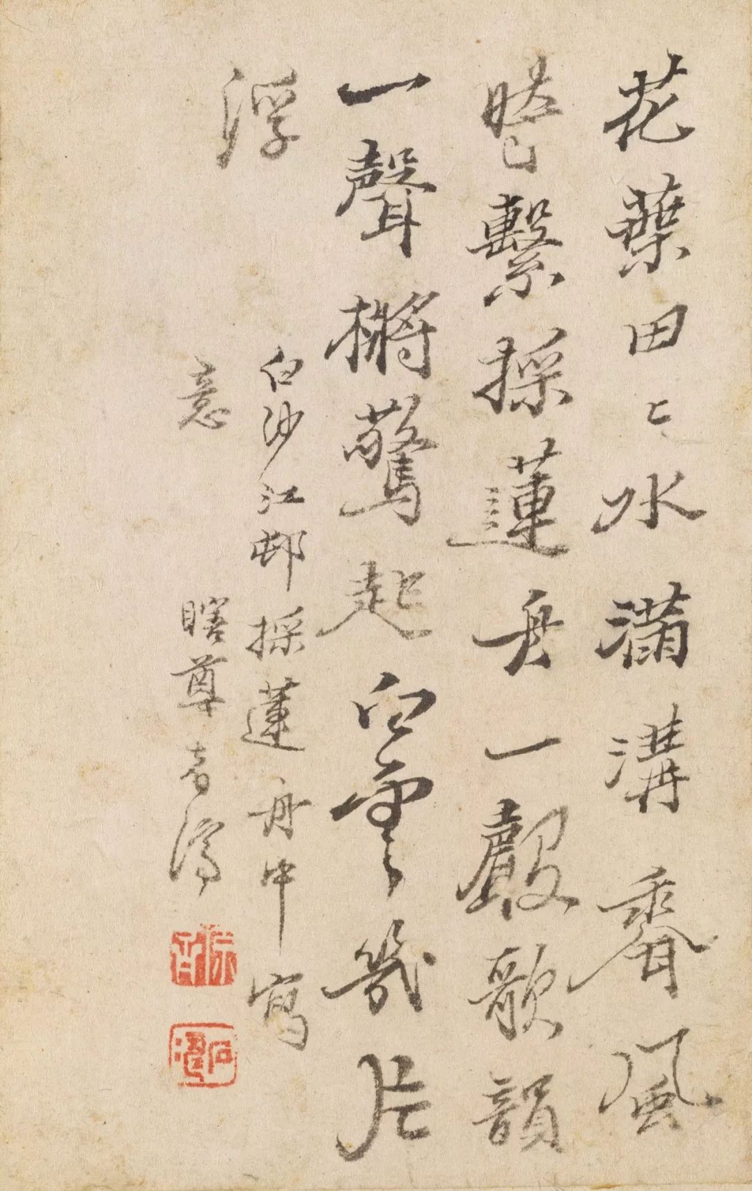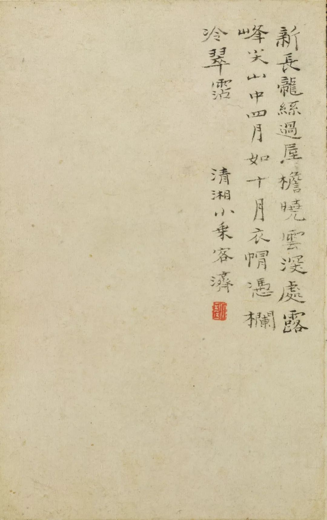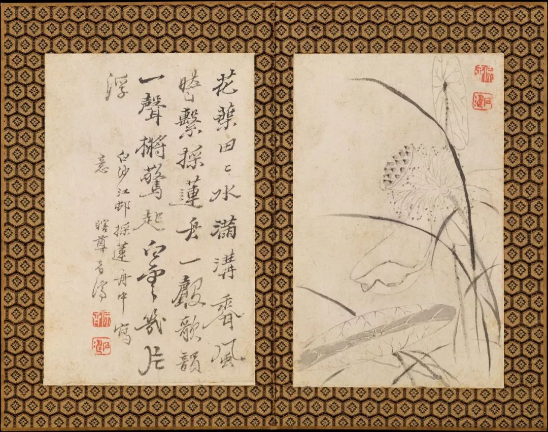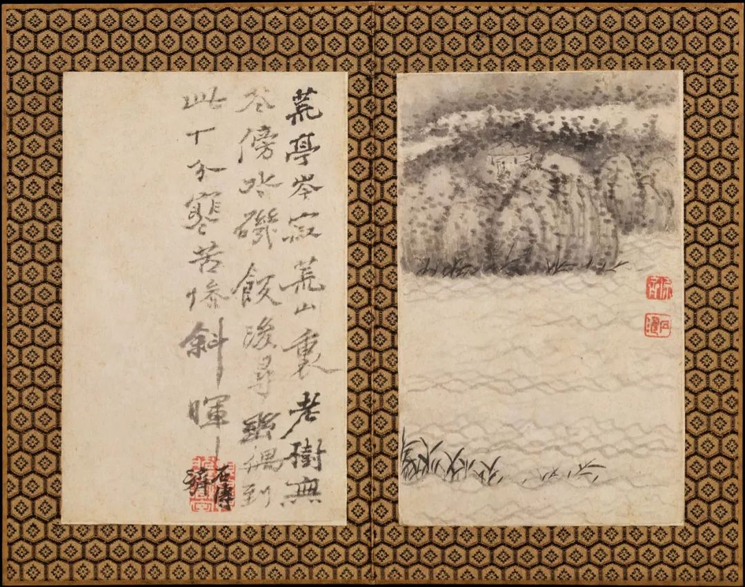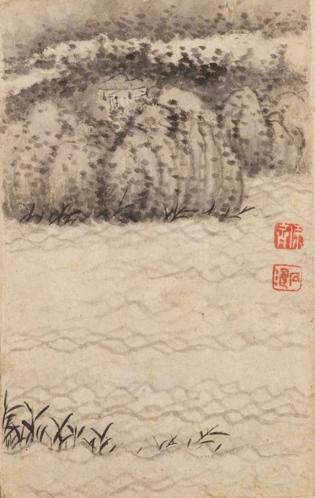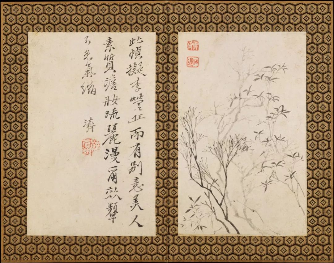 此件《归棹册页》,内含十二开,尺寸:21.1×13.5cm,美国大都会博物馆藏。每幅册页中均在画面左侧配以诗文解说,寄情于画,同时助于看画之人理解。落款:“石涛”、“石道人”、“清湘道人济”、“苦瓜老人济”、“瞎尊者济”、“瞎尊者原济”、“清湘小乘客济”、“济”、“小乘客济”等;钤印:“原济”、“石涛”、“前有龙眠济”、“苦瓜和尚”、“释元济印”等。