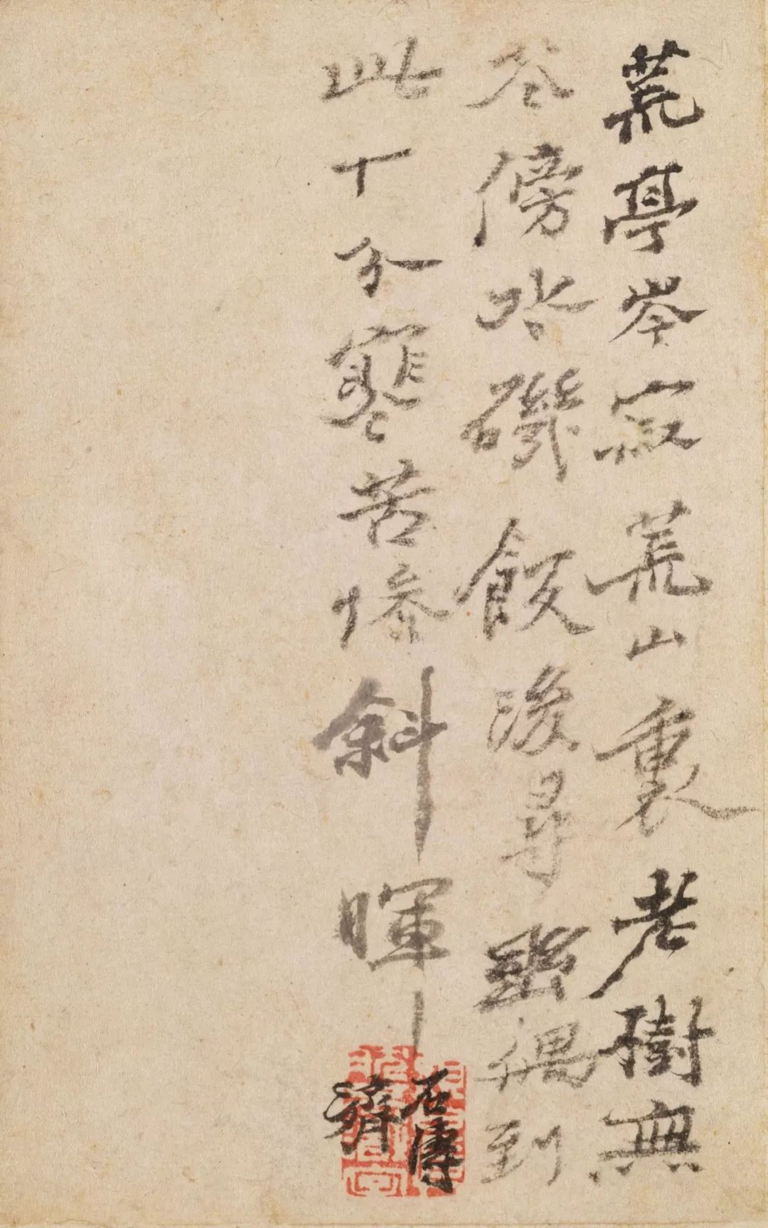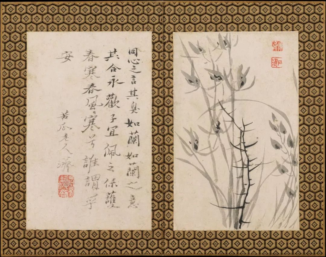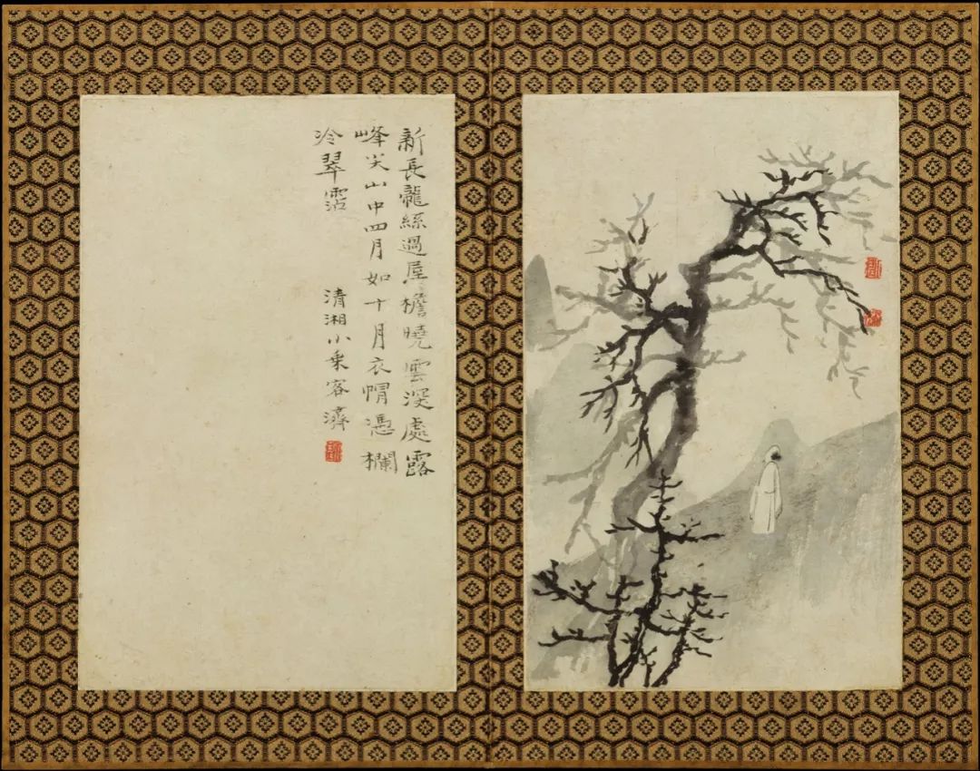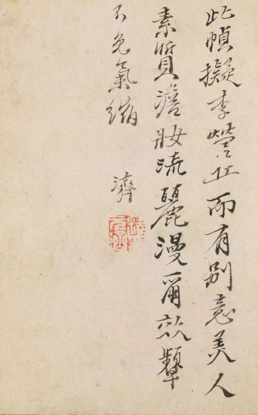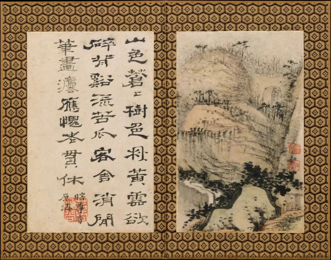 此件《归棹册页》,内含十二开,尺寸:21.1×13.5cm,美国大都会博物馆藏。每幅册页中均在画面左侧配以诗文解说,寄情于画,同时助于看画之人理解。落款:“石涛”、“石道人”、“清湘道人济”、“苦瓜老人济”、“瞎尊者济”、“瞎尊者原济”、“清湘小乘客济”、“济”、“小乘客济”等;钤印:“原济”、“石涛”、“前有龙眠济”、“苦瓜和尚”、“释元济印”等。