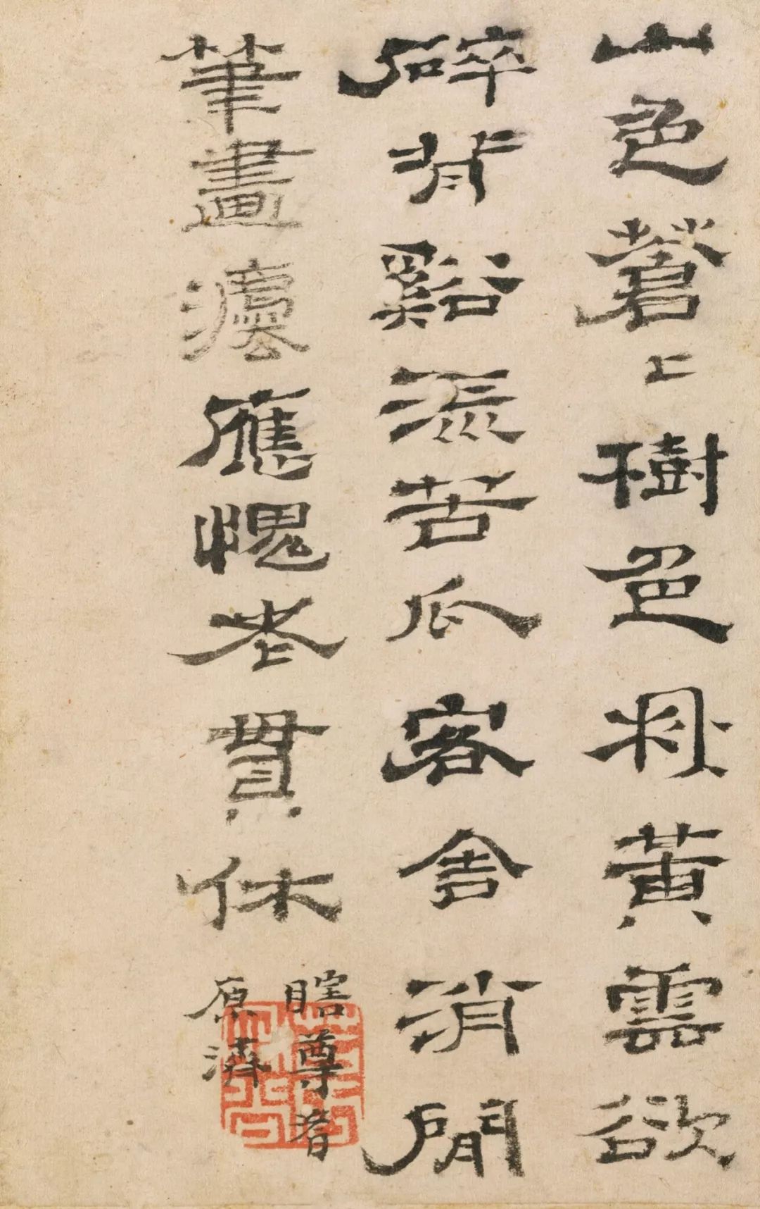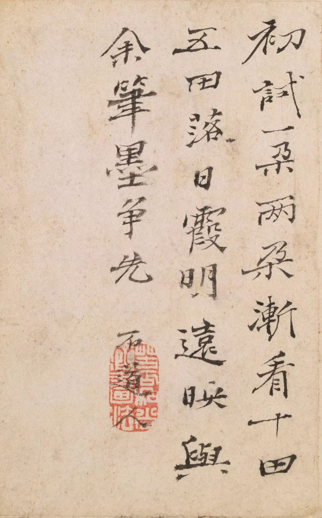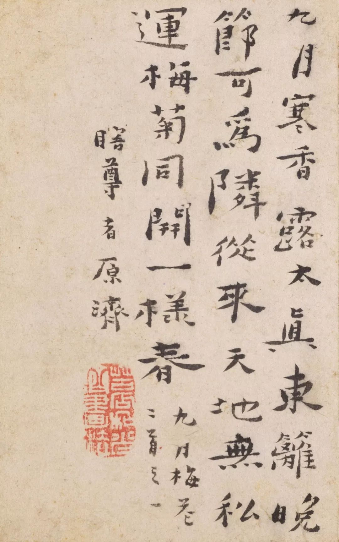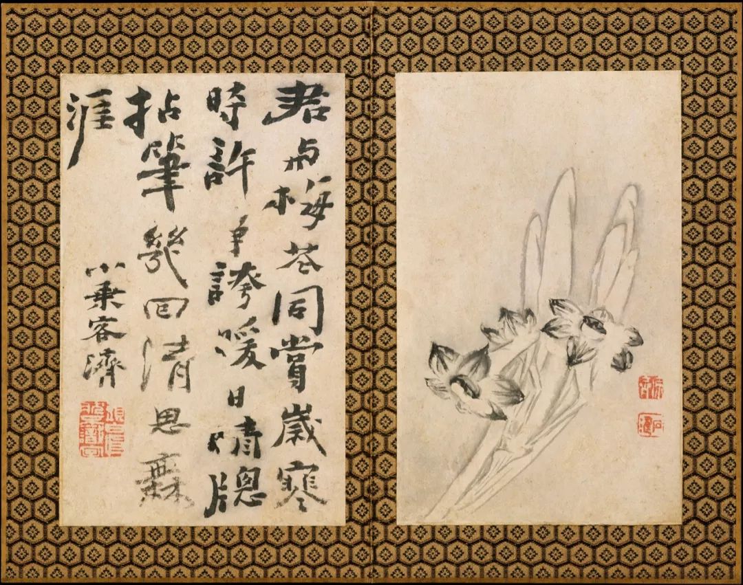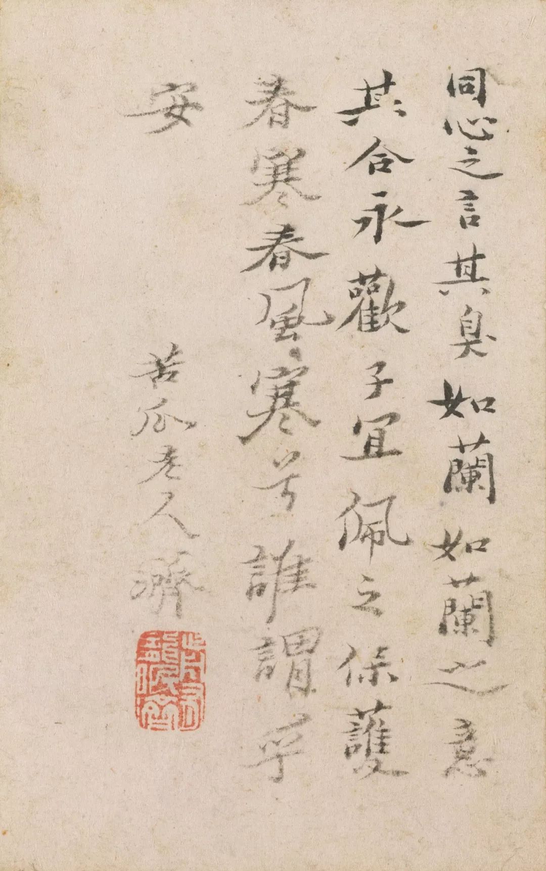 此件《归棹册页》,内含十二开,尺寸:21.1×13.5cm,美国大都会博物馆藏。每幅册页中均在画面左侧配以诗文解说,寄情于画,同时助于看画之人理解。落款:“石涛”、“石道人”、“清湘道人济”、“苦瓜老人济”、“瞎尊者济”、“瞎尊者原济”、“清湘小乘客济”、“济”、“小乘客济”等;钤印:“原济”、“石涛”、“前有龙眠济”、“苦瓜和尚”、“释元济印”等。