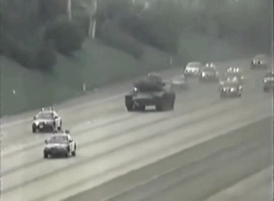 犯罪分子除了手中的武器与警察旗鼓相当外,在交通工具上面也不甘示弱,在一个极端的案件中,犯罪分子甚至驾驶着坦克与警方追逐。事情发生在1995年5月17日的美国圣地亚哥163号公路上,一辆M60A3“巴顿”主战坦克发了疯似的在道路上横冲直撞,后面是追赶它的几十辆警车紧追不放,这也成就了经典一幕。