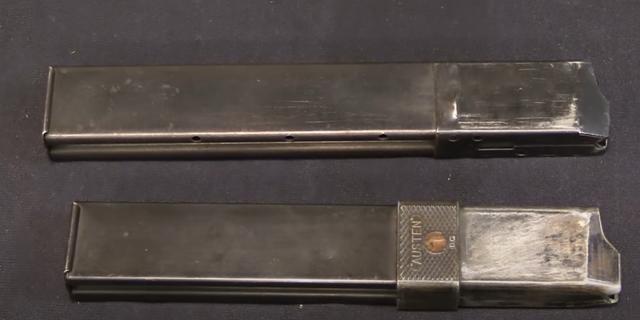 比较好玩的是奥斯丁冲锋枪和斯登冲锋枪的弹匣,斯登冲锋枪的弹匣是32发的,而奥斯丁冲锋枪觉得32发的弹匣并不可靠,弄了个30发的弹匣,两个弹匣是可以通用互换的,但是30发的由于做工问题,反而是比32发的冲压弹匣要重的多。