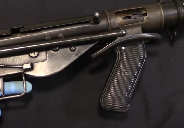 奥斯丁和斯登放在一起的话,最明显的就是奥斯丁带了一个手枪握把和一个前置握把,那个手枪握把其实是抄袭自MP-38冲锋枪的握把的。而奥斯丁的另外一个不同就是枪托,奥斯丁的枪托是金属折叠枪托,和MP-38是非常相似的,其实就是抄的。而英国人的斯登冲锋枪的枪托则是固定的,无法折叠。