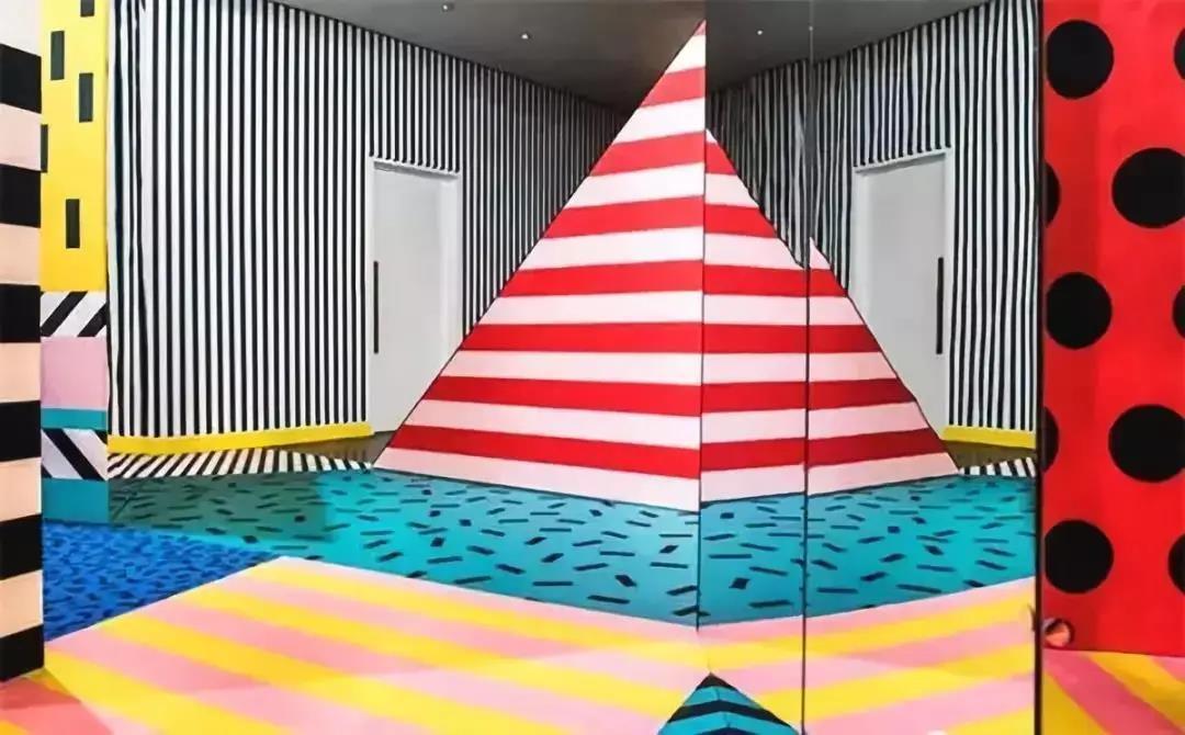 颜色明亮,五彩缤纷的孟菲斯配色不适宜当作日常家装,容易眼花缭乱~~不过在亲子以及娱乐场所中,这般跳脱的配色却很受欢迎!