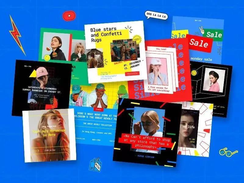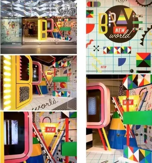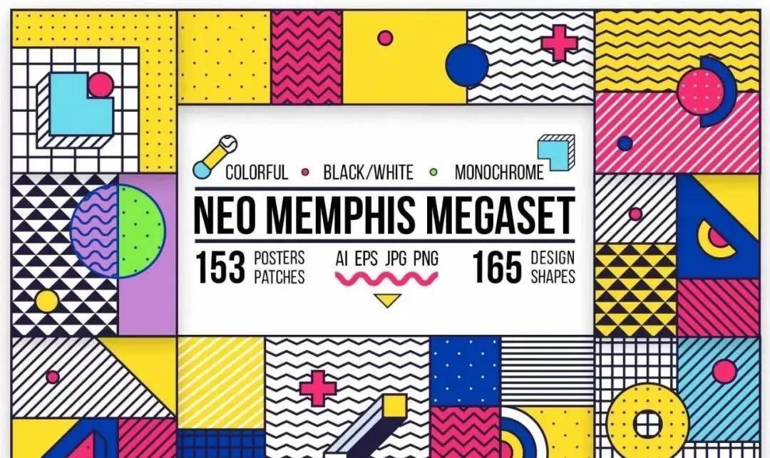 其次,孟菲斯风格设计较为大胆,色彩比较跳跃,元素之间没有过多的联系,比较适用于海报、图案、装饰设计、店面招牌等平面设计。