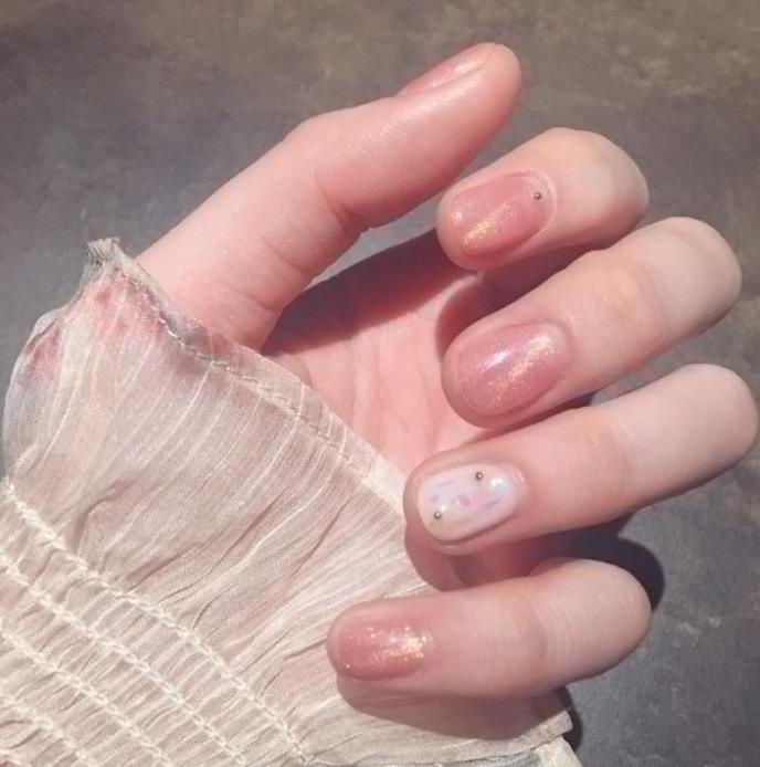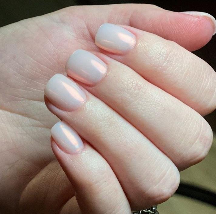 通过能闪耀出如极光般梦幻光泽的镜面美甲,除了基础的单色造型,也很适合以裸色、粉色、白色等温柔色系为底色,点缀于指尖前方突出层次感,打造出清新十足的美甲。