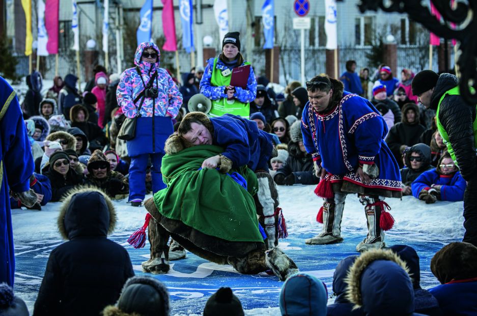 涅涅茨人身穿民族服装,进行传统摔跤比赛。