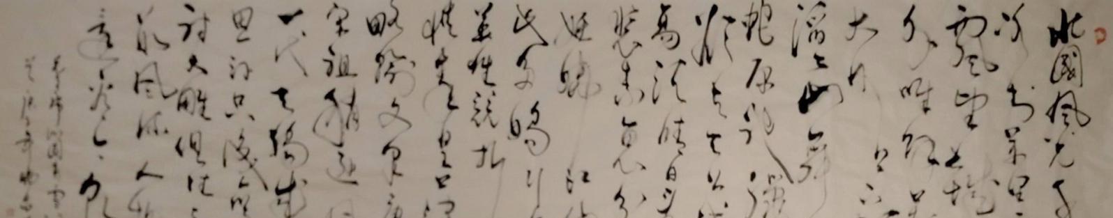 古人论书法,讲求形神兼备,犹贵于神。叶显明作书法,深谙此道,其笔墨技法娴熟,草书形态美塑造的无以复加,线条塑造铺陈痛快淋漓,意在笔先或凌空杀纸,若秋鹰追兔之神速,入木三分之力度,突显线条的翻腾铰转之神韵,姿态万千,变化莫测,险中求绝,此谓书法极至之形态美。形态美是依书抒情之框架,在这框架里再泊进情绪带动起来的意识流,执笔于心,心有所思,瞬间送于笔端,他的书法在情感的酝酿下,上下左右顾盼,疏密、张弛有度,无一笔呆作,无一字僵化,韵味自然,极富有美感。兴来小豁胸中气,满壁纵横字万千。依书抒情,意境之高,笔墨之神韵则不言而喻。