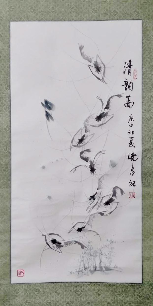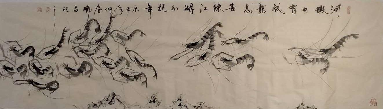 叶显明水墨画《河虾也有成龙志》180x70cm