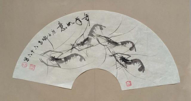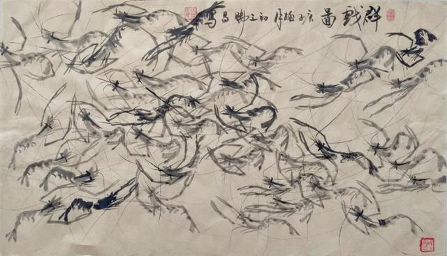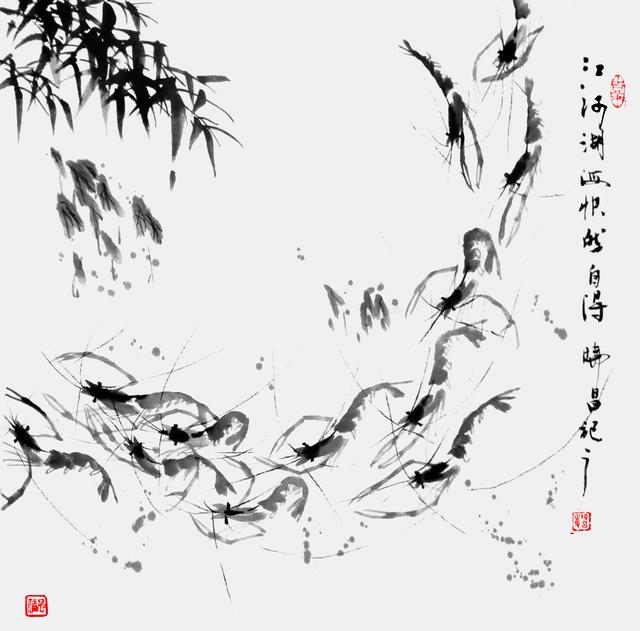 叶显明书法若疾风化雨,以书入画绘龙虾,更是动感十足、气韵生动的典范。世人画虾,各有其法,师造化勤写生是殊路同归。叶显明水墨画虾,有捉物置眼前之生动,绝非闭门造车,而是时常观虾劲,笔下虾有神。把视觉物象动态与绘画技法有机融合在一起,展现出托笔画虾须、重墨点虾脑的传神技法,用水墨把池中之物创作的活灵活现,大有呼之即出,极有精气神。叶显明虾作品,证明了这样一个论题:白石老人画虾趣意横生,他人画虾仍可别开生面,仍会有别有天地之卓建。