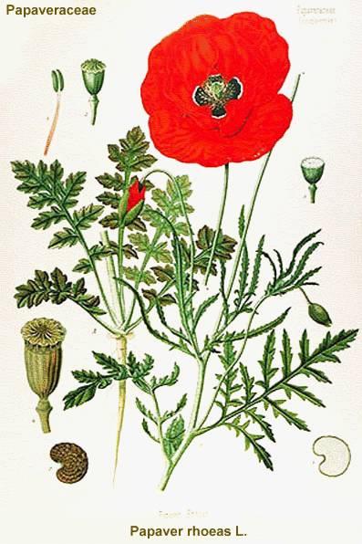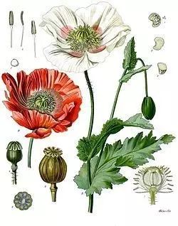 其错尚不止如此。《鸦片史》译本中的“苞鳞罂粟”注明原文是Papaver bracteatum。苞鳞是指裸子植物雌球花上珠鳞背面基部的一个薄片,而罂粟科属于被子植物门,此处bracteatum当译为“苞片”更为合适。不过,这种植物通用的中文名是大红罂粟,因其可达20厘米直径的猩红色大花朵而得名。大红罂粟也叫大猩红罂粟、伊朗罂粟或波斯罂粟,与东方罂粟有较近的亲缘关系。该种是一较为耐旱的多年生罂粟,花朵单生枝顶,在花瓣基部还有明显黑点,其生物碱总含量的95%是蒂巴因,但没有吗啡。可见,如果说大红罂粟能产生鸦片,那么试问罂粟属下植物哪一个又不产鸦片?