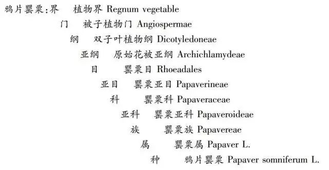 要判断布思的说法,首先要弄清楚什么是“罂粟家族”。“罂粟家族”是以鸦片罂粟(Papaver somniferum L.)为核心,主观判断各种植物与其亲缘关系后形成的一个植物群概念。应当指出的是,作为“家族”代表的鸦片罂粟种并不是物种自然进化的结果,而是人类干预自然的产物。最迟在公元前4000年,步入农耕社会不久的欧洲先民就开始驯化野生的刚毛罂粟(Papaver setigerum DC.),进而培育出这种一年生的鸦片罂粟。时至今日,它仍然不能像它的同类一样在真正的野生环境中生存。即使没有人类干预,它的生息之地也不会离开人类垦殖过的土地。其主要植物学特征为:“植株高30—150 厘米。茎直立,不分枝,具白粉。叶互生,叶片卵形或长卵形,基部心形,边缘为不规则波状锯齿,具白粉,叶脉明显,略突起。花单生,花梗长。萼片2。花瓣4,近圆形或扇形,白色、粉红色、红色、紫色或杂色;雄蕊多数,花丝线形,白色,花药长圆形,淡黄色;子房球形,绿色,无花柱,柱头呈扁平盘状体。蒴果球形或长圆状椭圆形,成熟时褐色。”在植物分类学中位置如下: