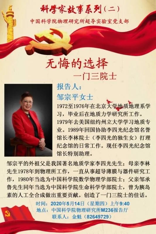 活动上,中国科学院物理研究所研究员李林院士的女儿邹宗平,讲述了其外祖父李四光、母亲李林、父亲邹承鲁一门三院士“无悔的选择”。