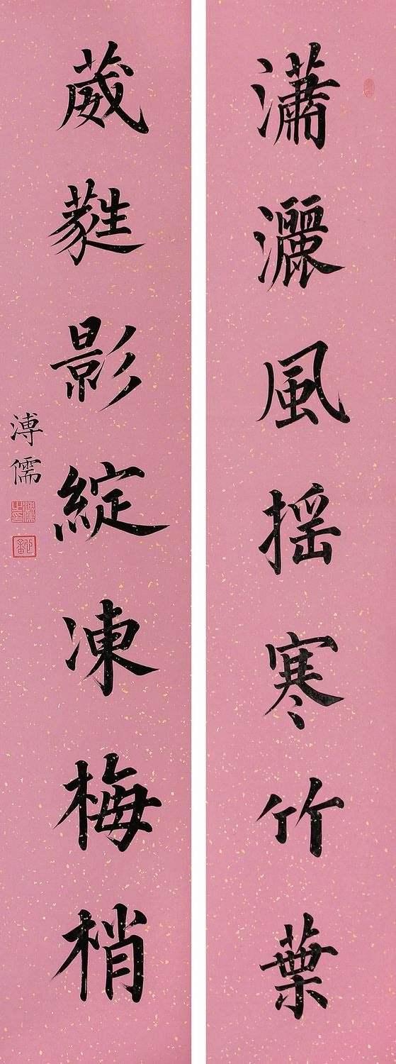 溥濡的大字楷书主要学的是唐代名家。尤其是欧阳询和柳公权,对他的用笔影响很大。当然了,他的书法还受到了成亲王的影响。总体来说,他的楷书,用笔精到,法度性强,特别是在起笔和收笔处,棱角分明,斩钉截铁,力道十足。