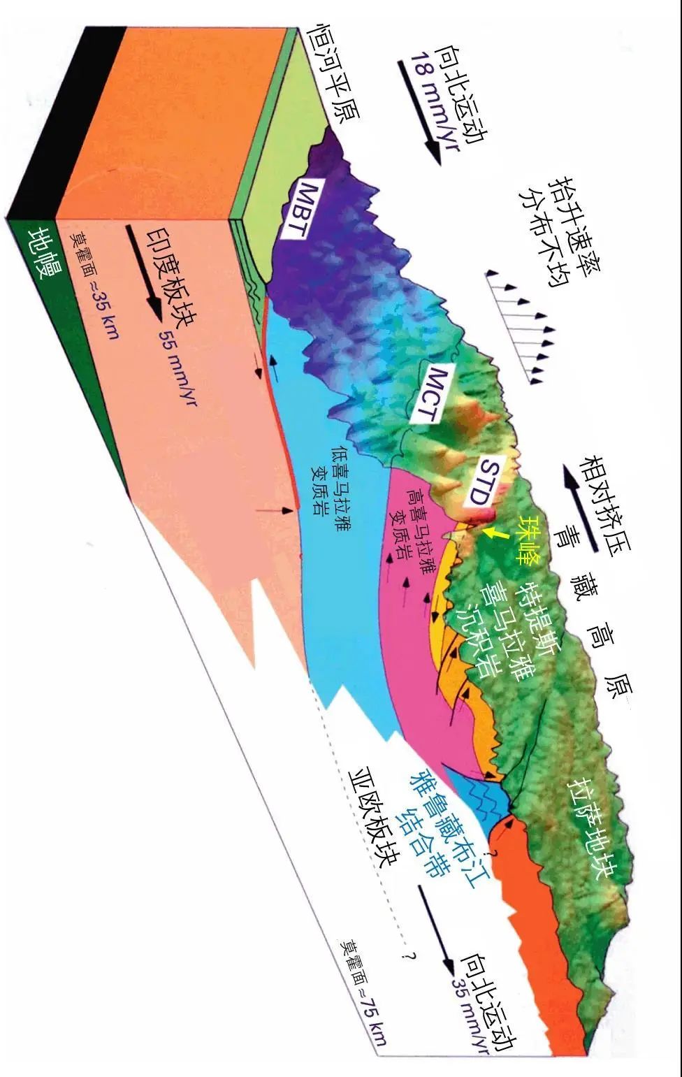 喜马拉雅山脉地层剖面示意图 | STD、MCT、MBT都是大型断裂带名称的缩写。其中,STD是藏南拆离断层,前文提及的珠峰顶部两条断裂属于STD。观察图中珠峰的结构,可见它由上部的“特提斯喜马拉雅沉积岩”和下部的变质岩组成。