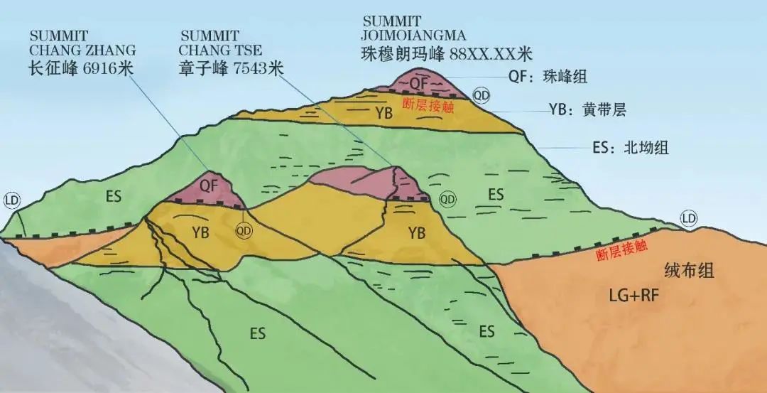 珠峰的地层划分简图 | 黄带层(YB)上下,分别是基本未变质的珠峰组(QF),和明显变质的北坳组(此图中缩写ES并非“北坳组”对应英文单词的缩写,它是另一个内涵相同的英文名缩写),底部的绒布组(RF)是更加古老的变质岩基底