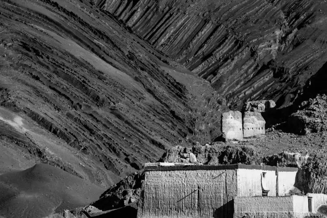 充满皱褶的山体下的民居