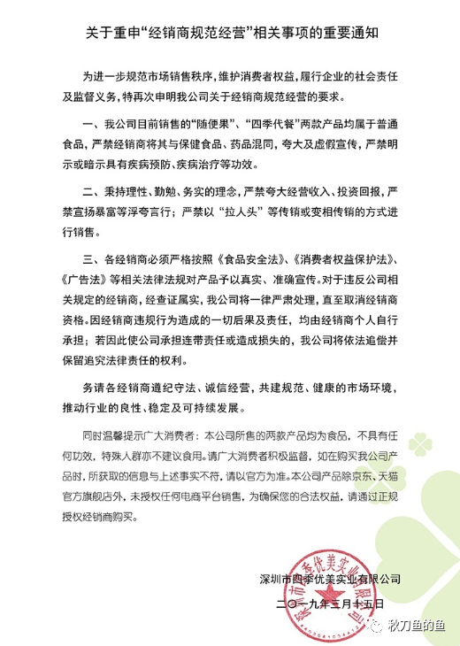 其实之前四季优美随便果就因为虚假宣传被有关部门处罚过,像模像样的发表了自己的产品是普通食品的通知。