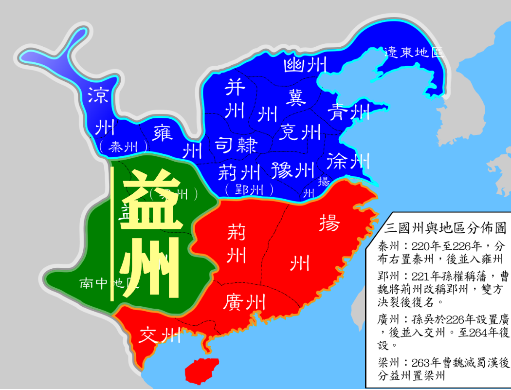 蜀汉建国于益州,益州大体相当于今天的四川、重庆和云贵以及陕西的一部分,是当时天下面积最大的一个州。