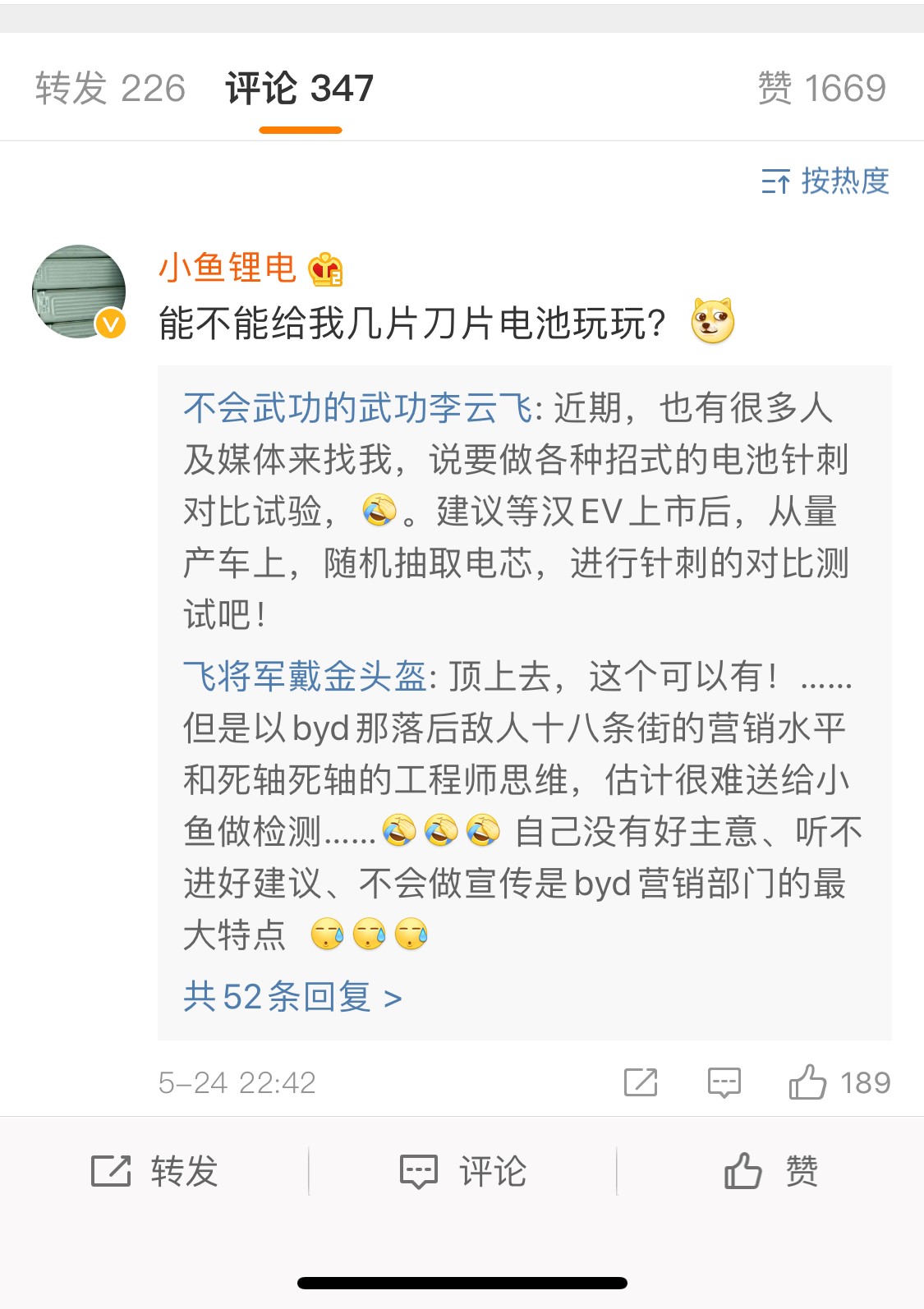 5月24日,李云飞再度发博表示,针刺试验的核心目的是让电池短路,以便观察电池的热失控情况,电池没短路的话,针刺试验就失败了。