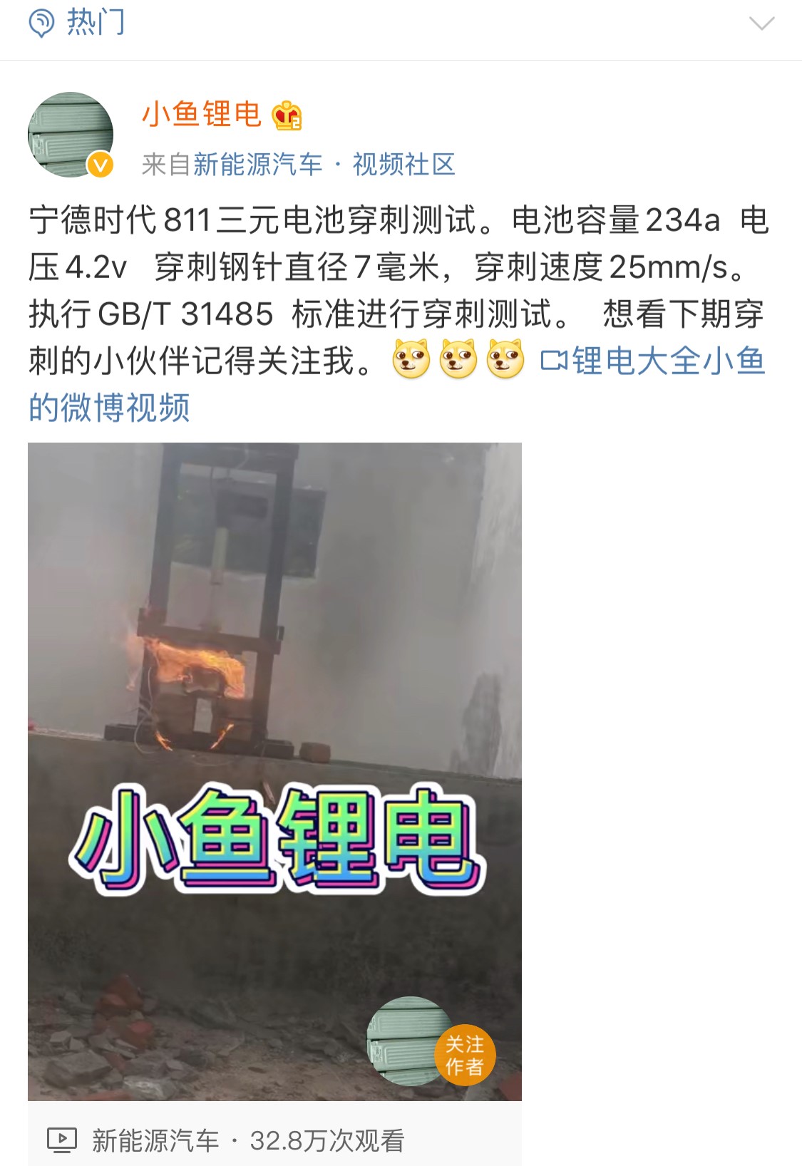 微博认证为汽车博主的“小鱼锂电”马上把给宁德时代“扎针”一事儿安排上了。5月13日,他在微博上公开众筹购买宁德时代单体电池。5月21日,小鱼锂电发布了对宁德时代811三元电池的针测实验结果与视频。钢针刺入电池内部后,电池短时间内膨胀并剧烈燃烧。