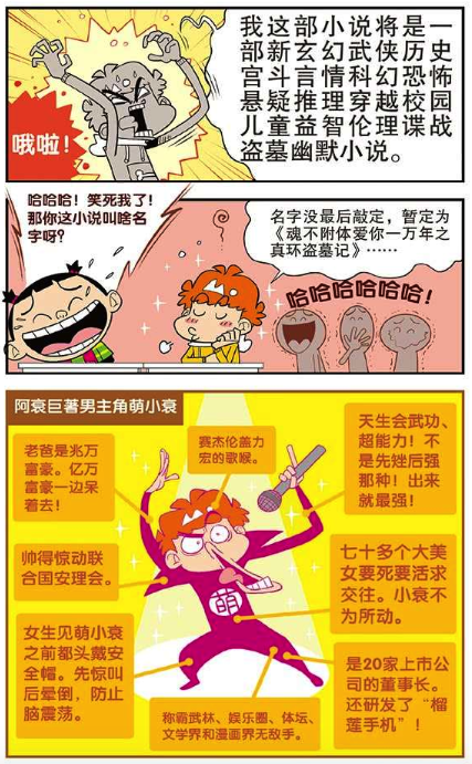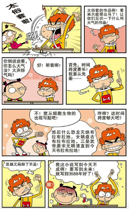 漫画中阿衰是一个脑洞很大的人,常常会想到一般人想不到的点子,他受到大脸妹的影响之后也打算写小说,而且他的小说跨度很大,几乎横跨了几亿年。不得不说阿衰的想法还是挺大胆的,只是一切不能只停留在想象中,要说到做到,不然就是空话。