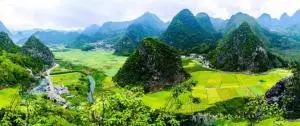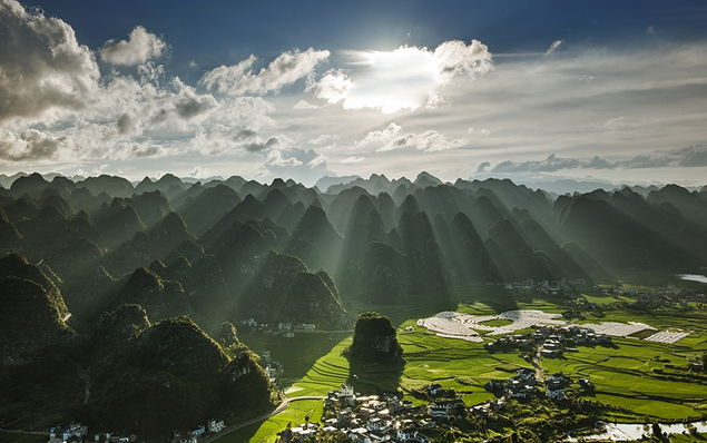 东峰林以巍峨的喀斯特峰丛为特征,山峦起伏,人烟稀至,一派原始景象。晴天观峰,可看“日出朝阳洒满谷”;雾中看山,则是“云霞明来或可睹”。而永恒不变的,是山环水抱中的农田。如果说东峰林以田见长,那西峰林则以水取胜。
