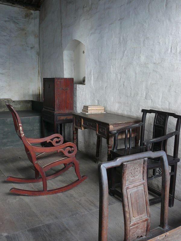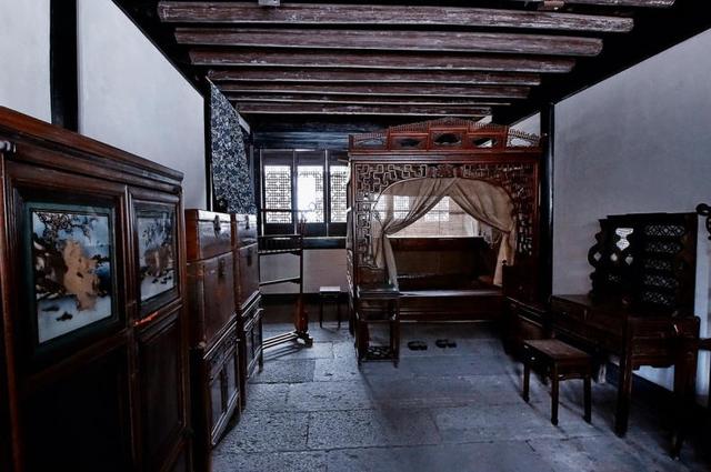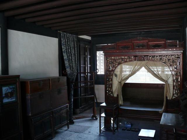 这个就是卧室了,看看古色古香的红木家具,红木床,柜子,还有桌椅,架子床,衣柜,箱柜,木躺椅,衣架等物。每年寿镜吾只收八个学生,教学收入有限,但教学质量比较高。石板铺地的房间,光线也不错。
