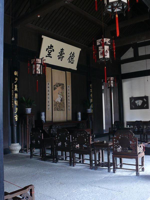 第二进是大堂前,是祖宗忌日,红白喜事,贵宾到来聚会的地方。有一副对联,品节泰山乔岳,襟怀流水行云。后面还有对寿镜吾德行言论的赞颂一副,道德嘉谟见风骨,箴言懿德泽桑梓。