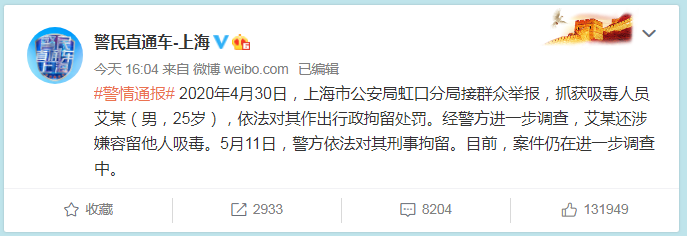 上海市公安局虹口分局于4月30日接到群众举报,抓获吸毒人员艾某(男,25岁),依法对其作出行政拘留处罚。经进一步调查,艾某还涉嫌容留他人吸毒。5月11日,警方依法对其刑事拘留。目前,案件仍在进一步调查中。