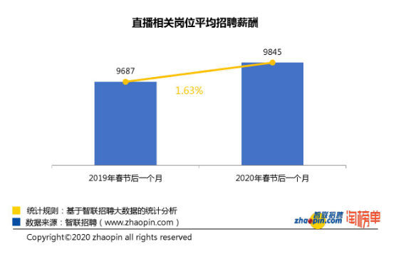 智联招聘携手淘榜单共同发布《2020年春季直播产业人才报告》,疫情下直播行业招聘需求同比逆势增长1.3倍,平均招聘薪酬为9845元/月。直播作为大多数行业转型的抓手,促使了直播人才的缺口越来越大。