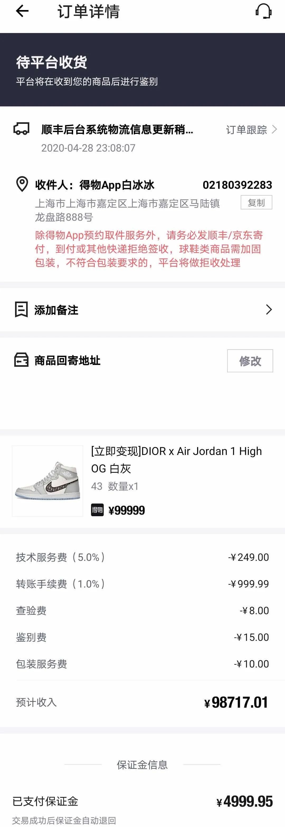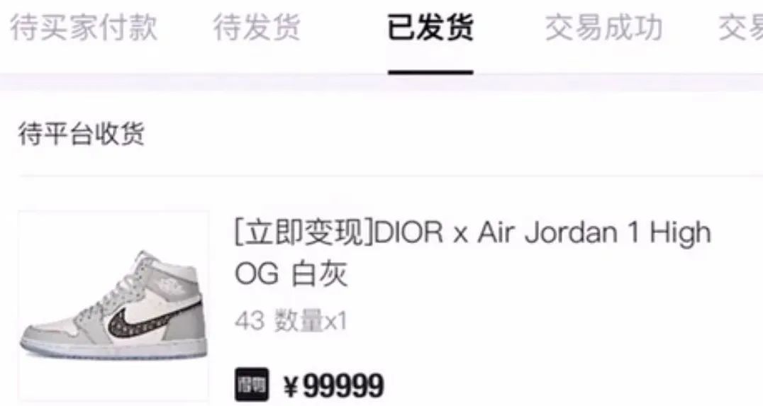 还记得在四月下旬, 名侦探柯猿曾发现了一缕蛛丝马迹 ,一位用户名为 “王*聪” 的大哥在得物App上, 以99999元的天价求得了一双 Dior AJ1 。