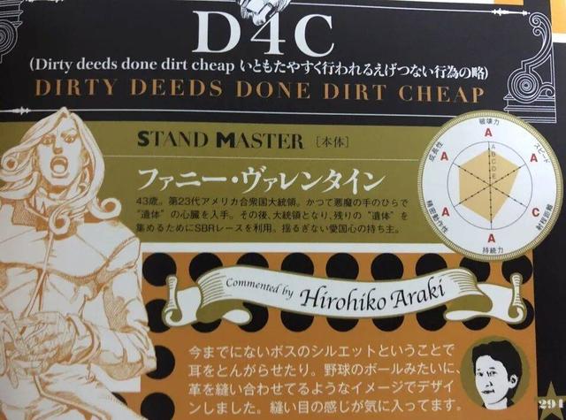 D4C为JOJO第七部飙马野郎中的反派BOSS瓦伦泰总统的5A替身,抛开能够穿越至平行世界的能力外,D4C最为人津津乐道的一点,当属被力速双B的骇人恶兽DIO压制了,总统还因此不得不拉来多个平行世界的总统助战。