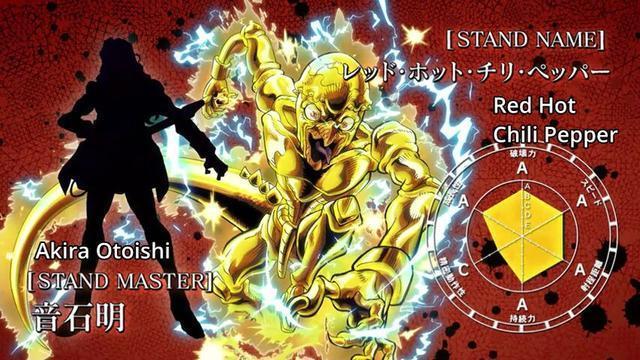以上就是拥有五A面板的4个替身了,但就近身格斗的表现来看,辛红辣椒是除了白金之星外肉搏最强的5A替身,和“5A之耻”完全不沾边,若要排名的话大致就是:白金之星>辛红辣椒>亲吻≈D4C(后两个差距不大)。当然,这是单论近战表现,不计算替身能力的排名。