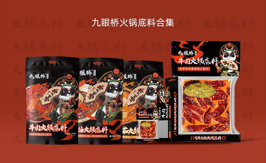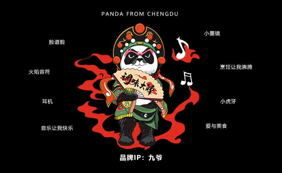 九眼桥调味料品牌,依托全球闻名的成都地标文化元素——九眼桥而成立,品牌用熊猫形象结合川剧元素,塑造了一个生活在成都的九爷形象IP,分享九爷在成都邂逅的各种美食,分享成都人对生活的洒脱态度。