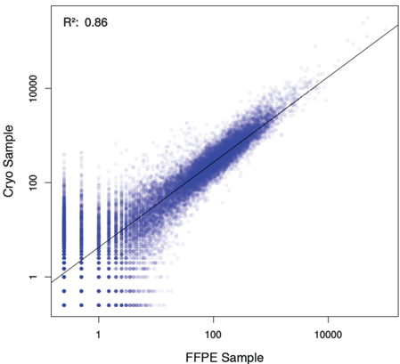 通过使用同一来源的不同质量RNA样本进行比较,评估QuantSeq适用于高度降解的样本(如FFPE样本)的能力。将人的MOLP-8肿瘤细胞系分成两份,一份进行新鲜冷冻,一份处理成FFPE样本,从而使同一个来源的样本得到不同质量的RNA。用RIN值(RNA完整度)来区分RNA的质量。RIN值大于8表示RNA质量高。对应严重降解的样本,RIN值不适用于质量的评估,因此使用DV200值(大于200nt的RNA片段的分布值)来表示RNA质量。低完整度的RNA对应低DV200值。RNA提取后,FFPE样本的DV200值为87%(RIN值2.8),冷冻样本RIN值为8.3。 使用50ng总RNA,用QuantSeq FWD 试剂盒进行文库构建。FFPE样本提取的RNA,即使DV200值低至23%(数据未显示)仍能成功构建QuantSeq文库。文库在Hiseq2500上进行用 1x 50 bp读长测序。结果显示FFPE-RNA文库和冷冻保存RNA文库的基因表达的相关性很高(R²= 0.86),表示QuantSeq能在不同质量的RNA中表现稳定(图8)。