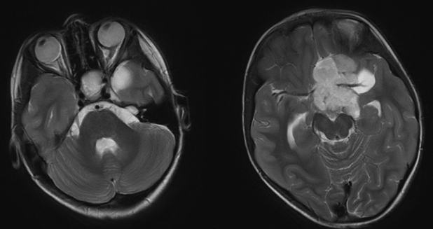 在长春新碱和卡铂化疗的初级疗程中,她的视野在两次连续的眼科检查中恶化,一次重复的MRI显示肿瘤增大。她被诊断为肿瘤进展,她的化疗方案改为硫鸟嘌呤,丙卡嗪,CCNU和长春新碱。MRI显示肿瘤进一步增大,脑室增大。病人被转到神经外科并接受了肿瘤次全切除。手术后6个月,她的病情稳定下来,直到MRI检查发现残余肿瘤增大,这导致了第三次埃维莫司化疗。治疗结束后,她进行了定期的眼部检查和神经成像,并保持稳定5年。