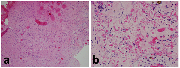图3:视神经胶质瘤的组织学。低倍镜(a)显示纤维背景中有中度细胞性肿瘤。高倍图像(b)显示罗森塔尔纤维/嗜酸性颗粒体和透明血管。