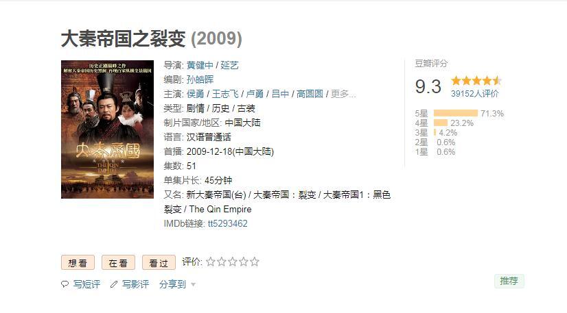 在电视剧方面,秦王朝题材的作品,已经屹立着三座高峰,而且还是同一个IP系列《大秦帝国》,改编自孙皓晖的同名历史小说,2009年第一部《大秦帝国之裂变》评分高达9.3分,2013年第二部《大秦帝国之纵横》也获得9.2分的评价,2017年第三部《大秦帝国之崛起》,口碑虽和前两部有些差距,但也处在8.5的高分位。
