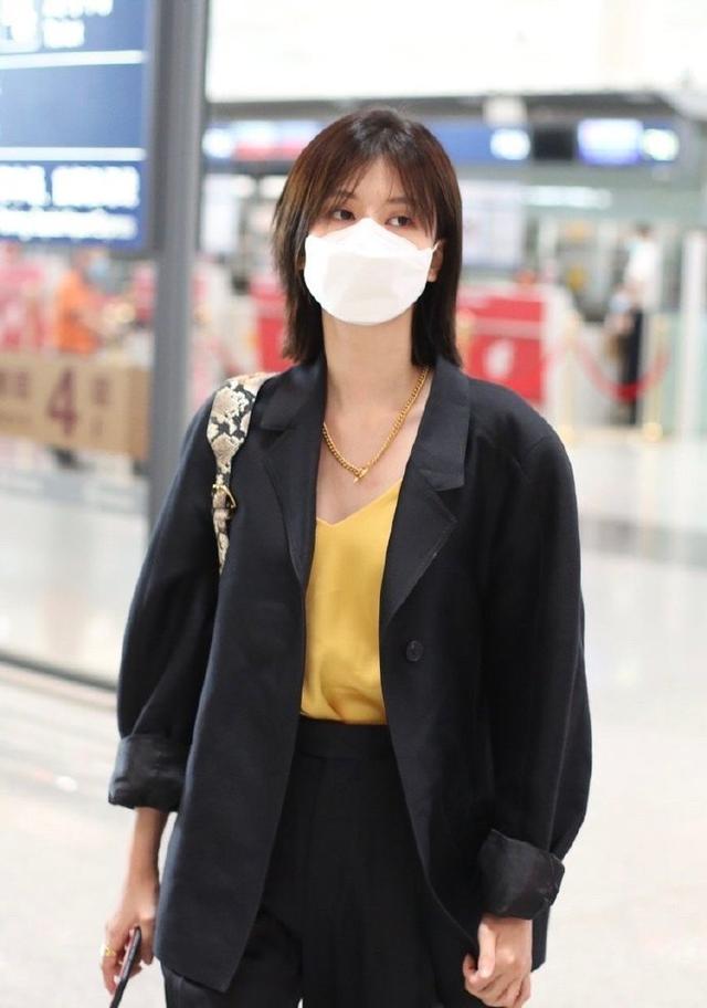 大家要注重西装的内搭,一般来说我们在穿西装的时候里面都会搭配衬衫,但是衬衫会显得非常正式,这个时候可以适度借鉴t恤来打造出时尚感,相对来说更加休闲,利用率也非常的高,而搭配了这一种黑色西装也会显得更加时髦,例如乔欣为自己选择了黄色t恤,简单又利落。