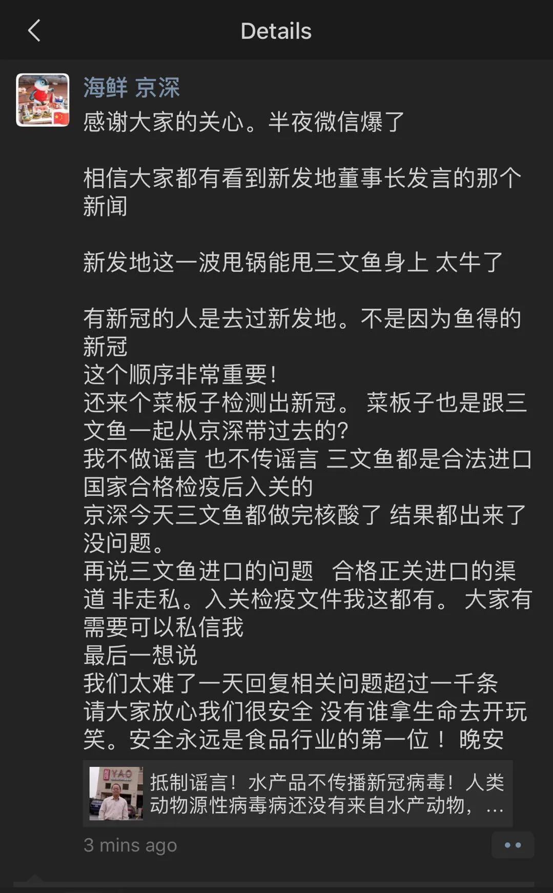 3、所以“切三文鱼的案板上检出新冠病毒”,这很可能是被市场环境感染的结果,而不是源头。