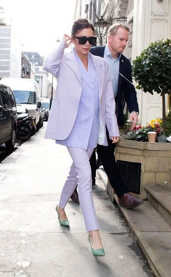 见惯了职场上面的黑白灰服饰,这种香芋紫的西服套装就显得格外的新颖了,依旧是常规的西装剪裁,穿起来版型也是十分的周正的。内搭一件西装上衣作为内搭,同类型的风格融合在一身,和谐度满满,而脚上穿着一双淡绿色的尖头高跟鞋,再戴上一副帅气的墨镜,拉风感十足。