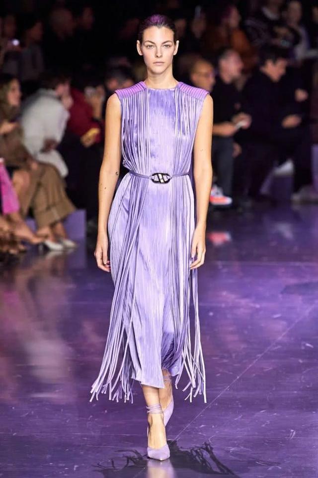 这款带有礼服廓形的香芋紫连衣裙,淡雅的色调带来一种高贵的感觉,凸显出气质十分的出彩。裙身是无袖的剪裁,穿着露出手臂舒适自在,百褶修饰在裙身的不同地方,打造出层次感和立体感出来。而裙摆上面的长长流苏晕染,又显得灵动和飘逸感满分,造型新颖的腰带束出了玲珑的水蛇腰,搭配紫色调的高跟鞋,整体穿搭显得十分的协调。