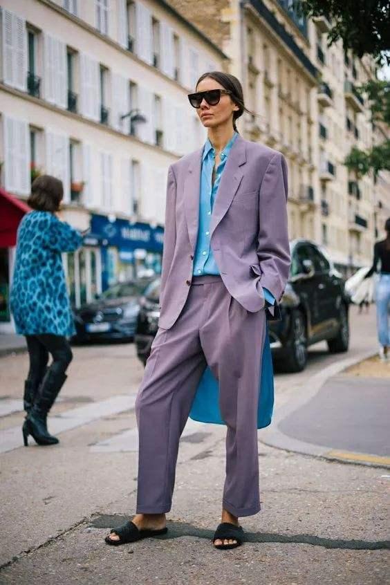 西服套装现在早就不再是职场的专属,在日常生活中,这样的穿搭也是司空见惯。这条香芋紫西服套装,微微带有一丢丢休闲的廓形,穿起来显得很是随性,但是它也同样的适合职场穿搭,可谓是一举两得。蓝色的衬衫作为内搭穿着,与香芋紫的西装外套,形成美好的视觉感,且还有层次,脚上的黑色凉拖,又将一份自在写意给完美体现。
