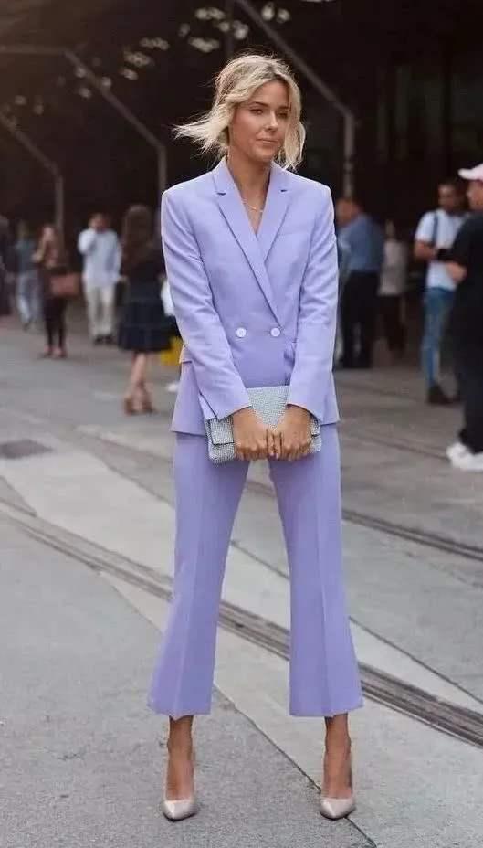 干练与简洁是职场丽人的普遍形象,那么穿上一套香芋紫的西装外套,这种感觉就会觉得更为的浓重。都是常规的西装式样剪裁,衣服是用的双排扣设计,这样更加具有立体感,看起来也觉得更为正式。下身的同色西装裤,裤口带点小微喇的廓形,可修饰腿型,搭配上一双淡粉色的高跟鞋,轻松穿出知性与端庄的淑女气质。