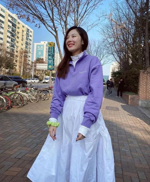 每个季节都有适合它的颜色,而夏天很适合的香芋紫就是很好的选择,这件香芋紫上衣,是运动款式,上身还非常的减龄。搭配上一条白色调的半身大摆裙,散发出满满的温柔淡雅感。衣服的内搭也选取白色调的高领小衫,无形中与半身裙上下呼应,形成整体穿搭的合拍感。