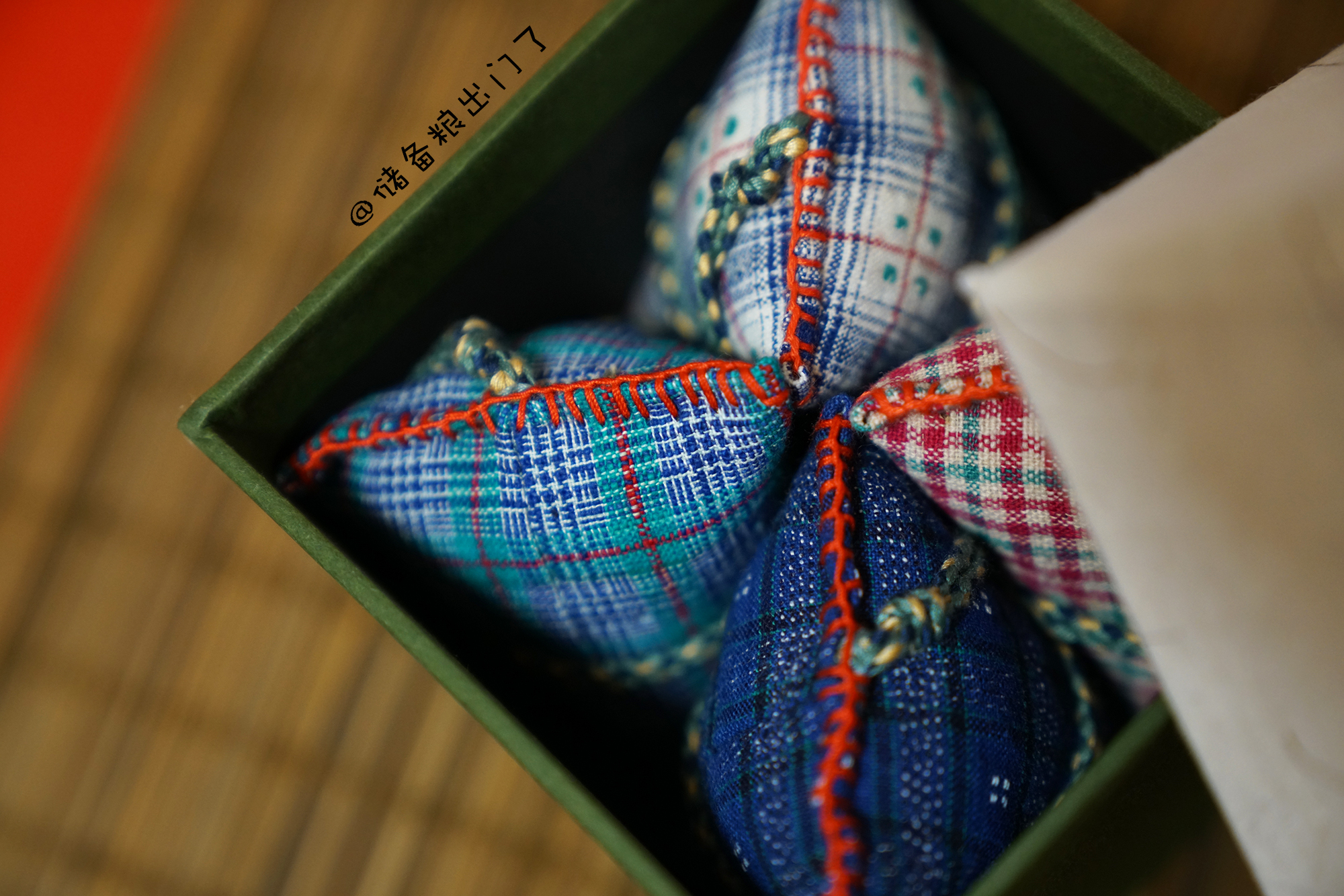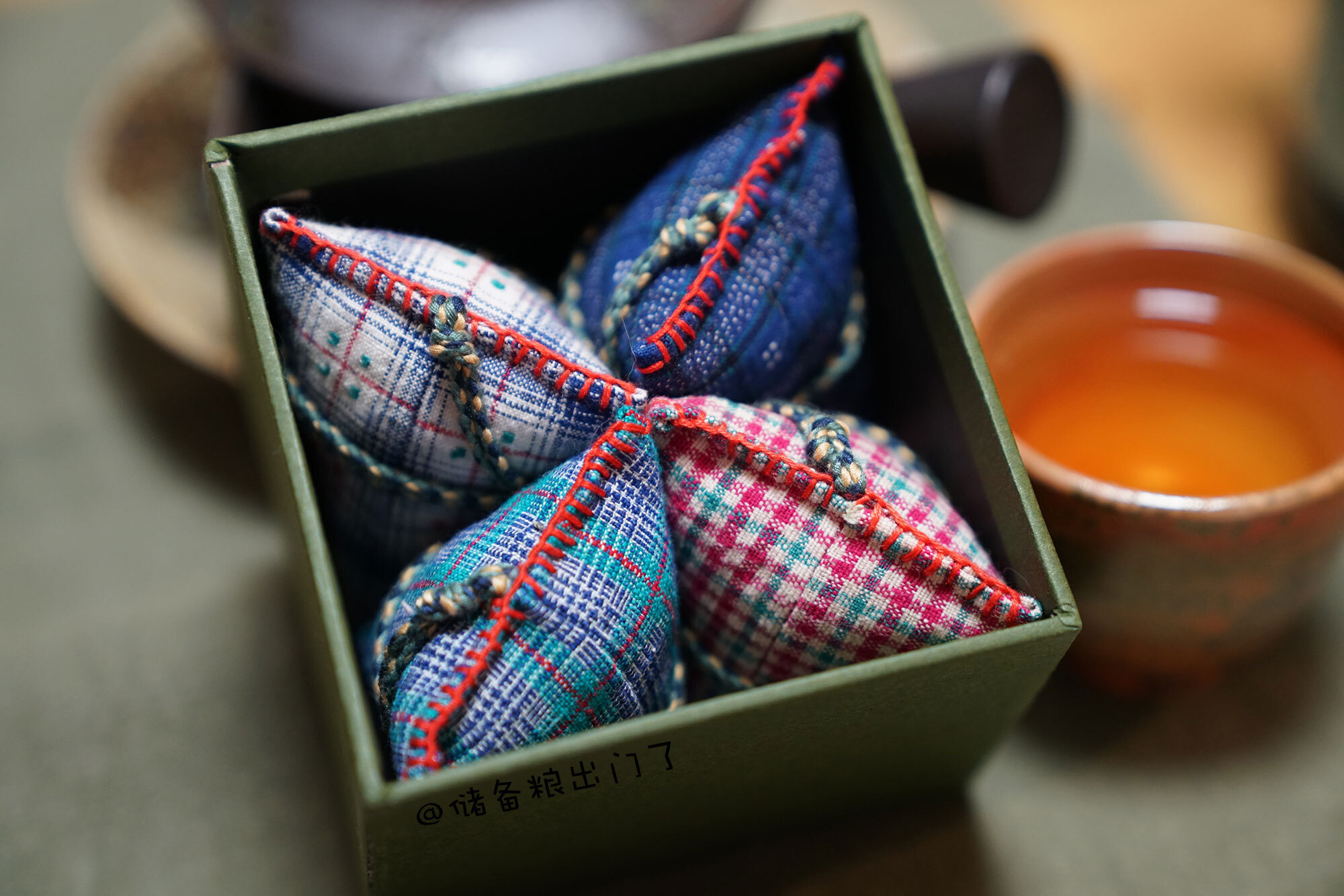 入夏以来已经被蚊子咬过太多次,找到景德镇的朋友帮忙找香包,她又拜托认识的人配了艾叶、紫苏、丁香、白芷等8味香味浓烈中草药,细细研磨成末,封装入纯手工的崇明土布袋中。