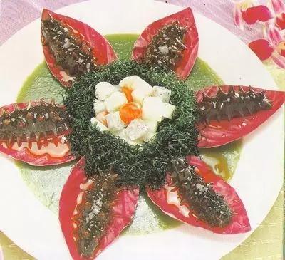2、发制好的海参煨透,放在紫甘蓝叶片上;